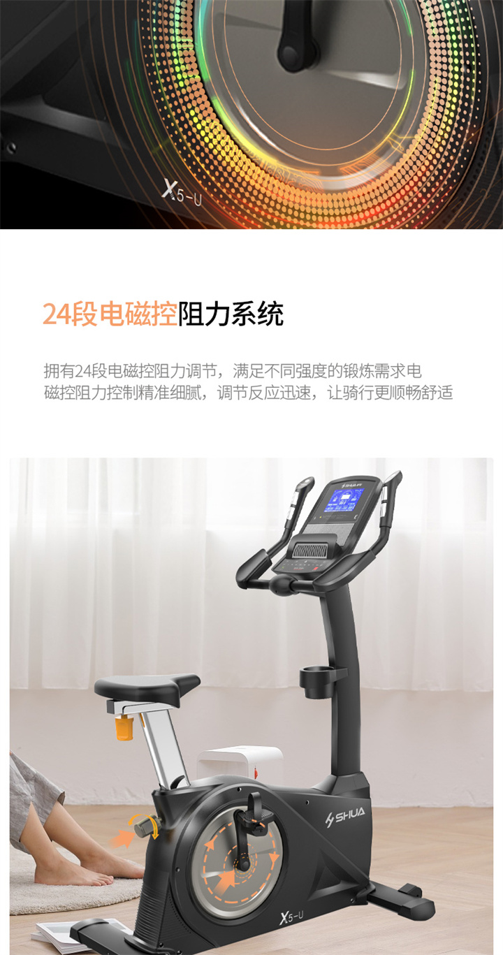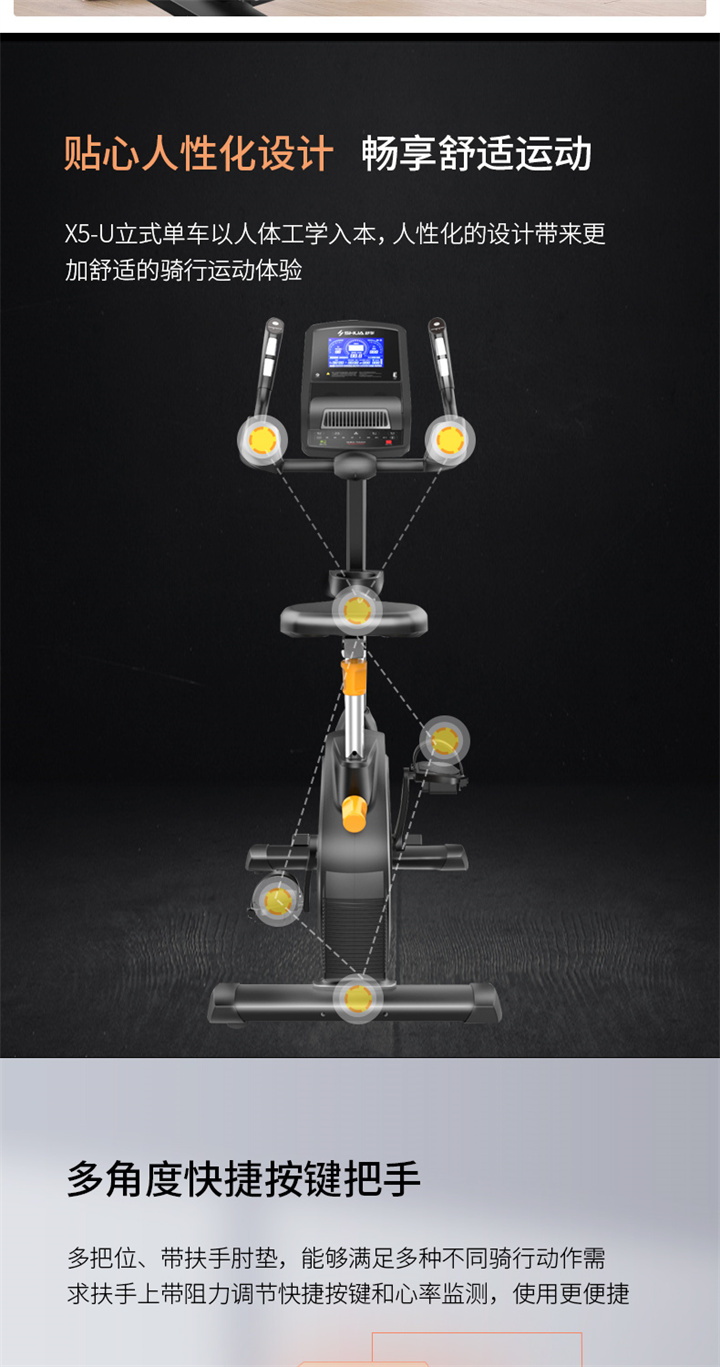 舒华立式商用健身车SH-B9100U(V10)触屏版拥有超大显示和操作屏幕, 可以任意设置阻力、时间和距离等参数,还可以即时显示心跳和转速等数据,同时,SH-B9100U提供多项科学运动处方,更轻松掌握运动节奏。