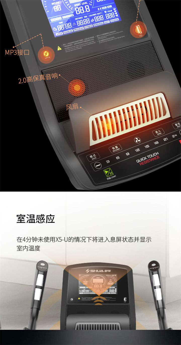 舒华商用椭圆机SH-B9100E(触屏版)采用电磁控系统的阻力系统,具有40段电磁控阻力系统,运用手握心率片侦测心率,9.3公斤飞轮质量。