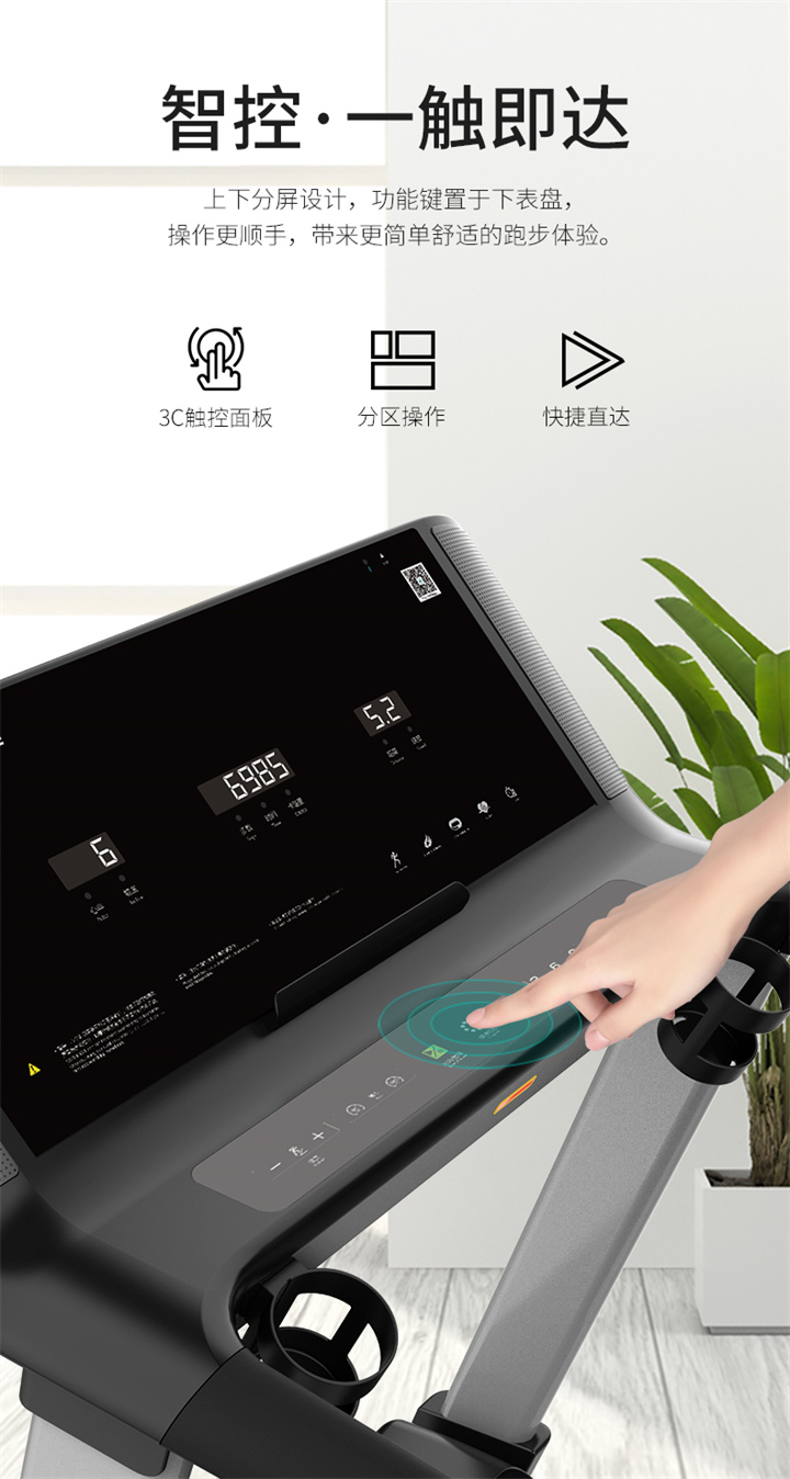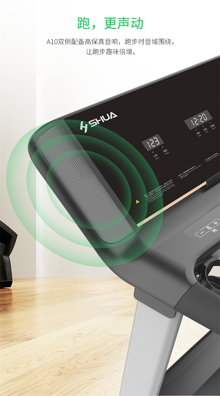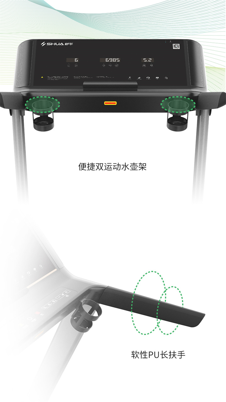 xc sports推荐健身器材-舒华商用电动跑步机SH-T6500拥有10.1寸IPS高清触摸屏、Z型动感时尚外观设计、70×150mm精钢立柱机身、F级高效静音马达、520mm商用豪华跑带和35mm双层全跑台减震跑板等优势,让您享受科学跑步。